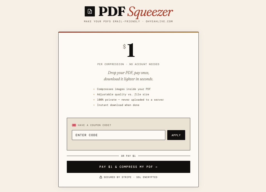 PDF too big to send? PDF Squeezer compresses your PDF right in your browser — no software, no account, no nonsense.